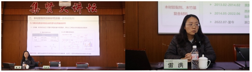 本次讲座以《木材胶黏剂创新与发展》为题。雷洪教授聚焦醛类胶黏剂与无醛生物质胶黏剂两大类别,系统介绍了其科研团队在多个方面的技术突破。相关成果已荣获国家科技进步奖,并成功实现推广应用。此外,她还分享了在植物蛋白胶、淀粉胶等新型胶黏剂研发方面的探索,并针对目前存在的性能短板提出了改进思路。