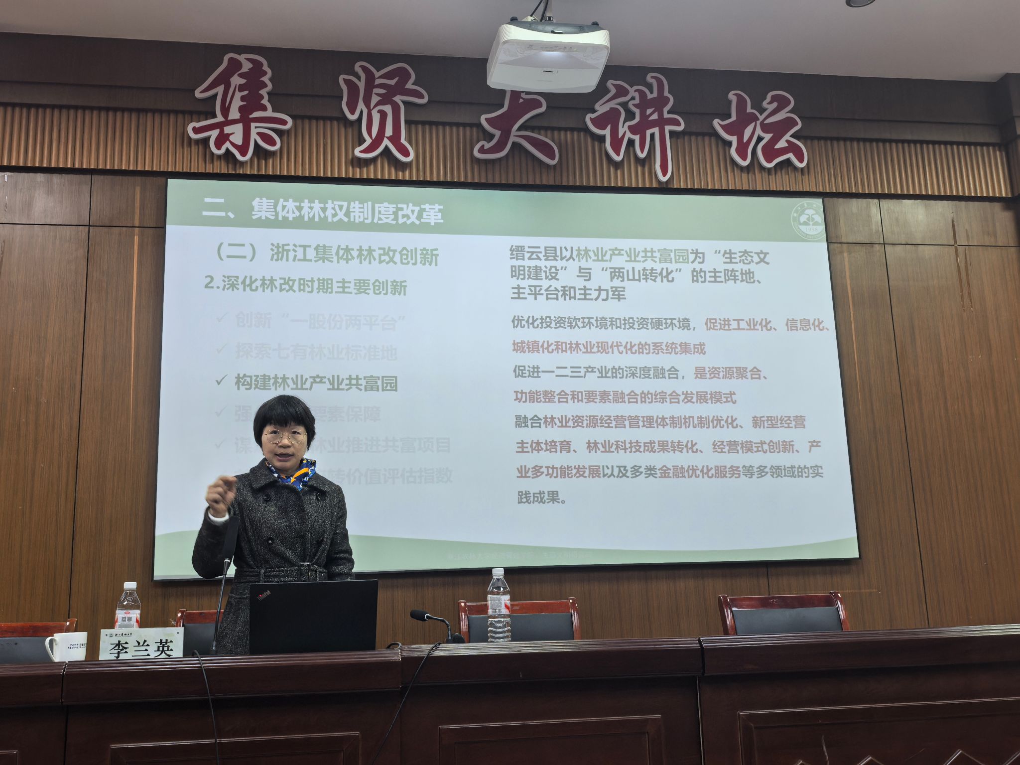 讲座中,李兰英教授以浙江省内实践经历为核心,系统梳理了当地集体林改革的发展历程,深入解读了改革在制度创新方面带来的生态、经济双重成效,同时客观分析了当前存在的林改问题与深化改革的具体思路,为同学们理解林业在乡村振兴与共同富裕战略中的关键作用,提供了生动的地方样本与理论框架。